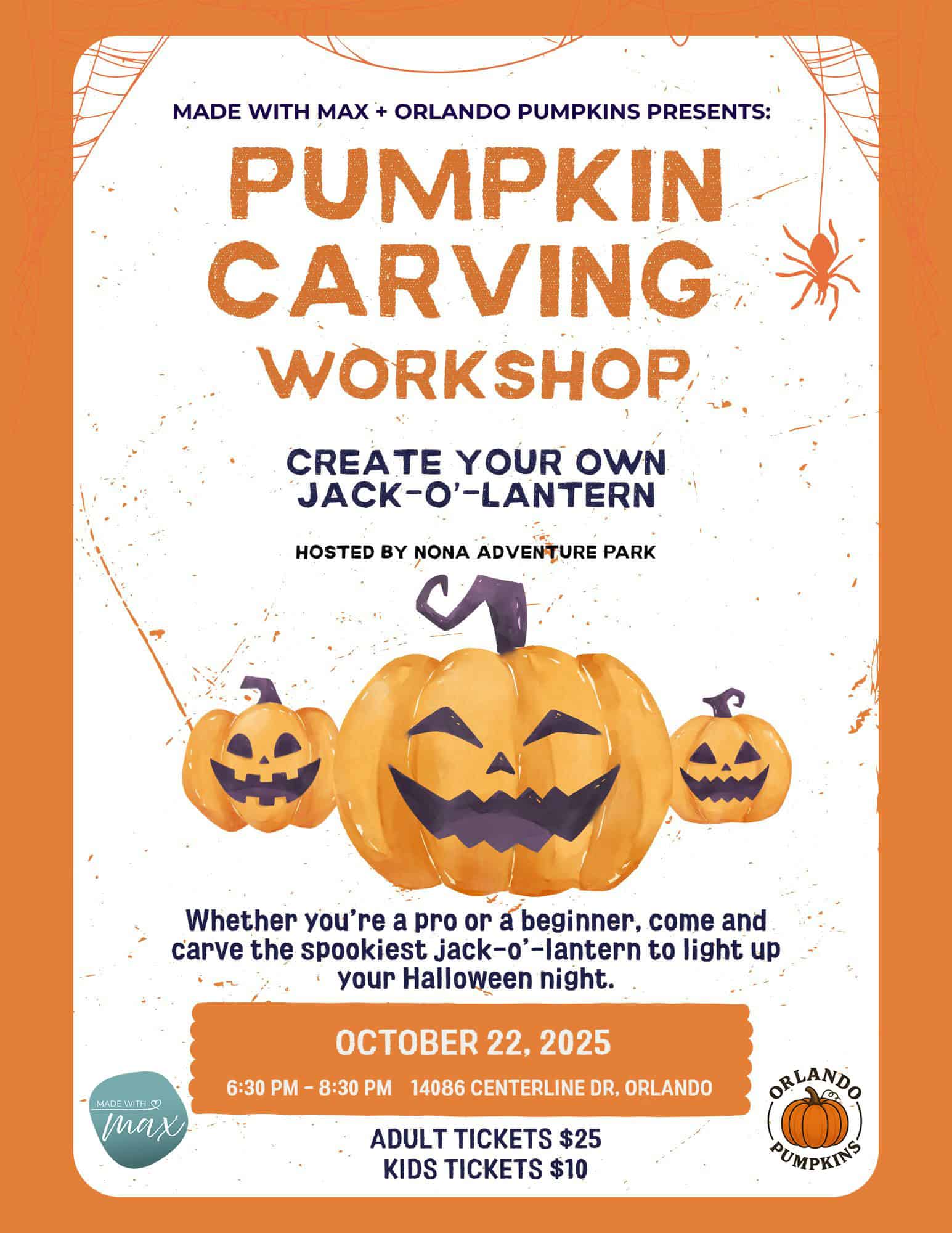 🎃 Made with Max Events and Orlando Pumpkins proudly present a Pumpkin Carving Workshop at Nona Adventure Park! 🌊